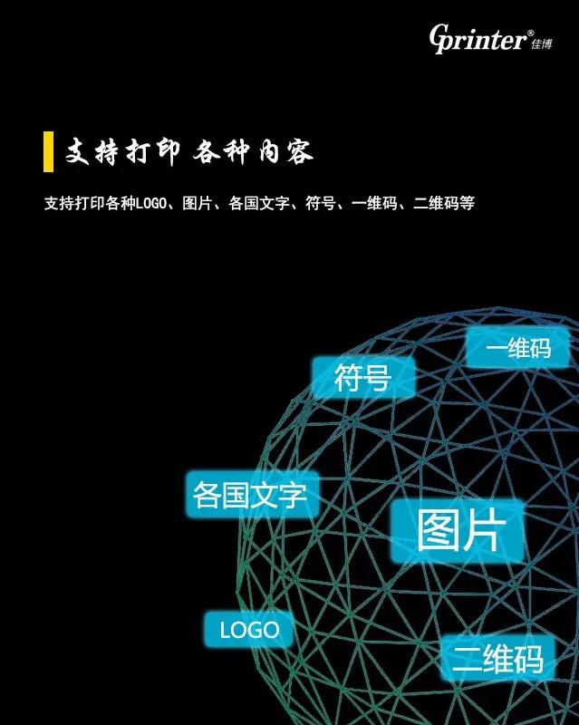 支持打印各种LOGO、图片、各国文字、符号、一维码、二维码等。