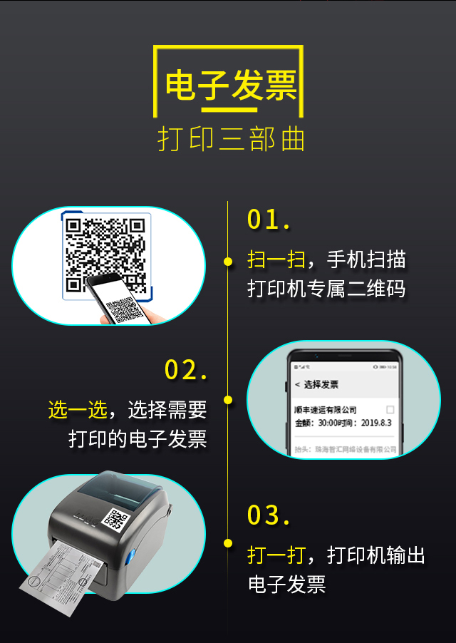 对于用户而言,使用微信或支付宝扫一扫贴在机器上的二维码,即可连接此打印机,选取需要打印的发票即可,短信发票则复制黏贴短信内容进行打印。